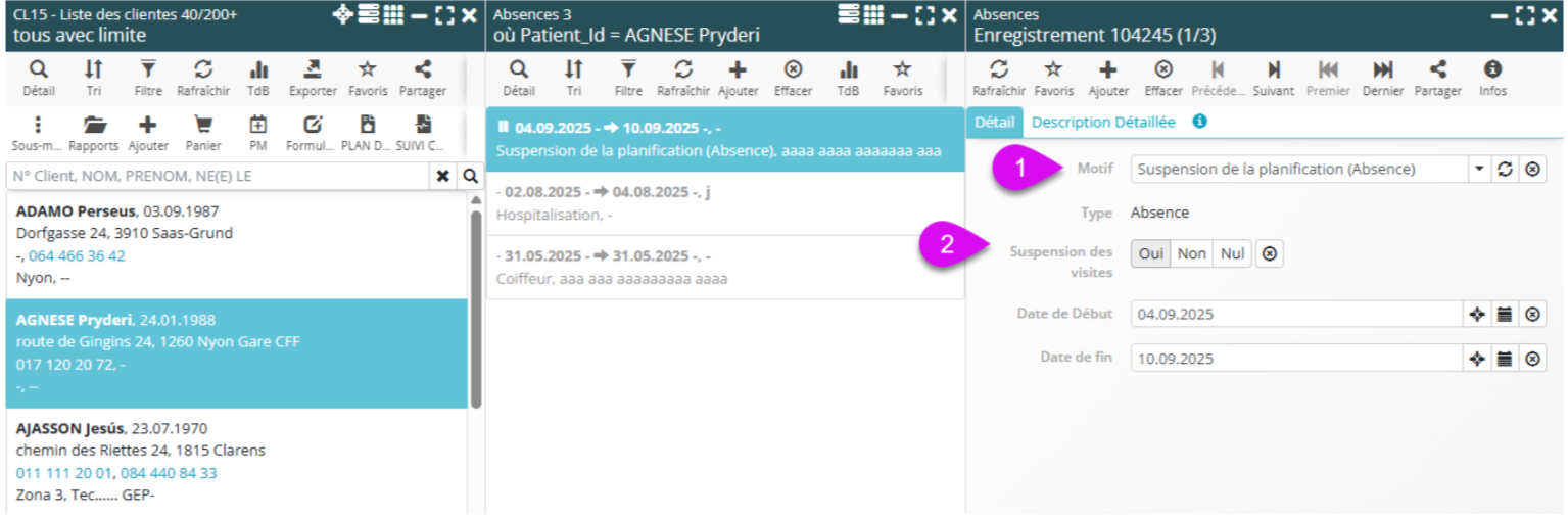 MedLink introduit une nouvelle absence libellée « Suspension de la planification (Absence)». Dès qu’elle est créée dans le dossier, toute la planification du client est automatiquement arrêtée pour la durée indiquée, sans qu’il soit nécessaire d’intervenir ligne par ligne.