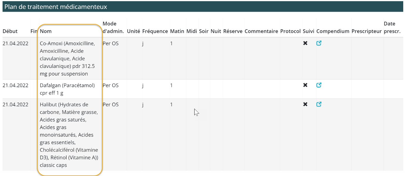 - Un intervenant terrain a toujours la possibilité de consulter les substances actives d’un traitement, au moyen du lien vers le Compendium.