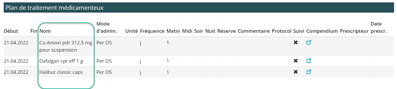 L’affichage du nom du médicament suivi de ses substances actives ne facilite pas la lecture des rapports, comme dans le Plan du Jour. Nous simplifions la présentation du rapport en ne conservant plus que le nom du médicament.