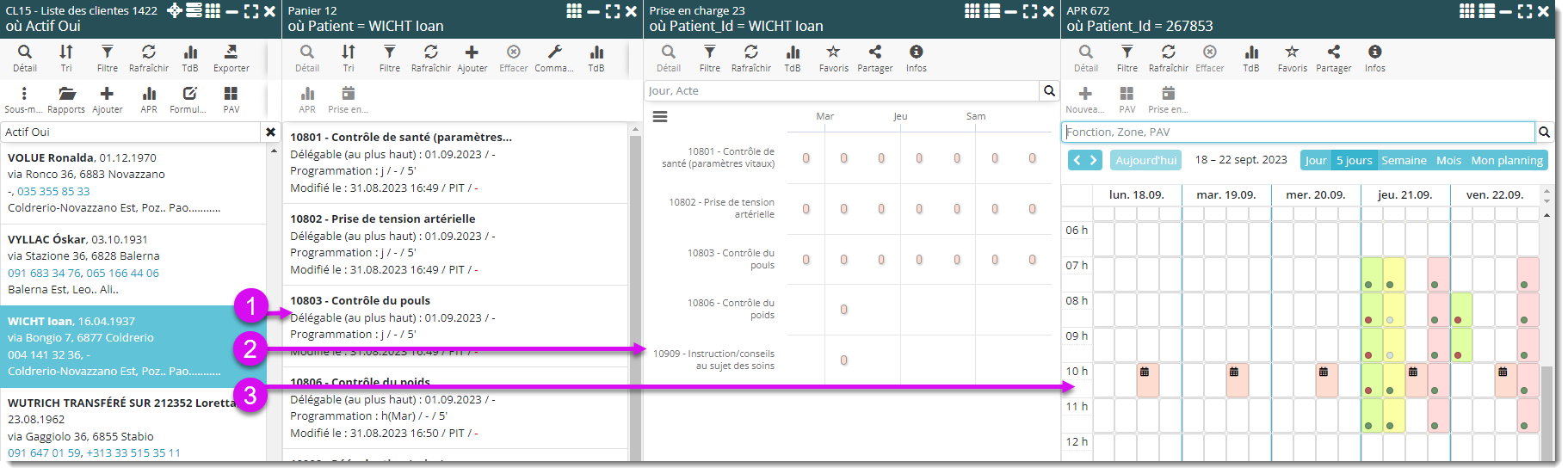 Prenons l’exemple de la structuration de la prise en charge : comment voir en un clin d’œil si les actes du panier sont dûment planifiés ? Avec le nouveau portail, il possible de visualiser en même temps le panier du client, la prise en charge et les APR.