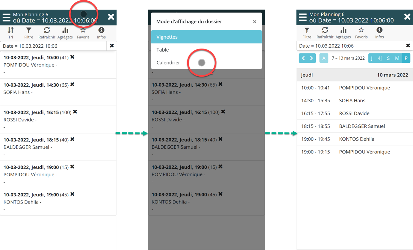 Vous souhaitez consulter Mon Planning. Il est ouvert en mode vignette et vous préférez le visualiser sous forme de calendrier. Comment procéder sur votre smartphone ?