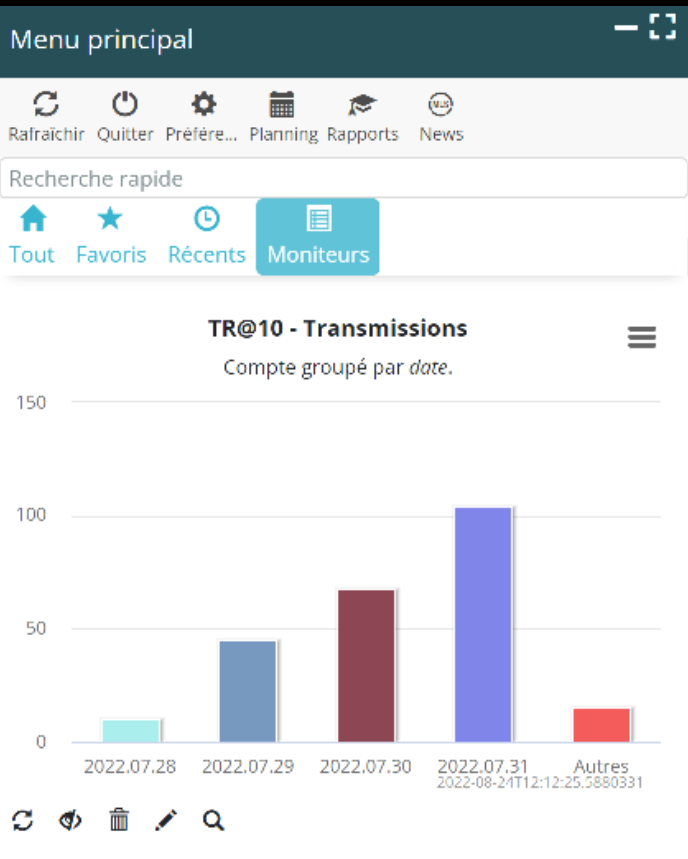 Un clic sur une colonne ouvre la liste des transmissions correspondantes. Un clic sur la loupe au pied du graphe ouvre l’ensemble de la liste.