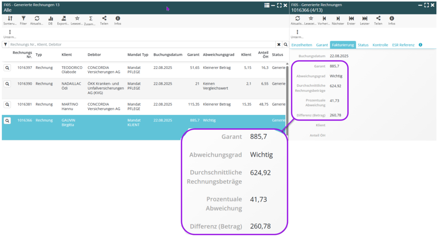 Die Qualität der Rechnungen wird massgeblich dadurch bestimmt, dass Unstimmigkeiten bereits vor dem Export rechtzeitig erkannt werden. Mit diesem Ziel entwickelt sich die FI05 – Generierte Rechnungen – weiter, um die Verantwortlichen für die Abrechnung der Spitex in ihrem Alltag noch effizienter zu unterstützen.