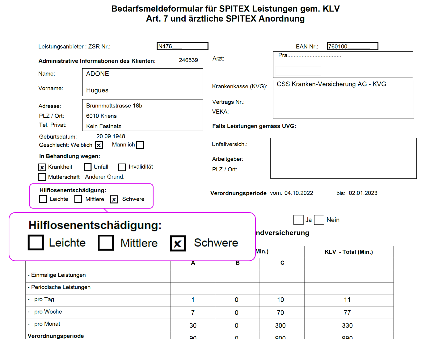 Das Gesetz (siehe Verordnung des EDI über Leistungen in der obligatorischen Krankenpflegeversicherung) sieht vor, dass der ärztliche Befund, der die Entschädigung für schwere oder mittelschwere Hilflosigkeit begründet und die von der AHV, der IV oder der Unfallversicherung ausbezahlt wird, als unbefristete ärztliche Verordnung oder Anordnung für die durch die Hilflosigkeit erforderten Leistungen gilt.