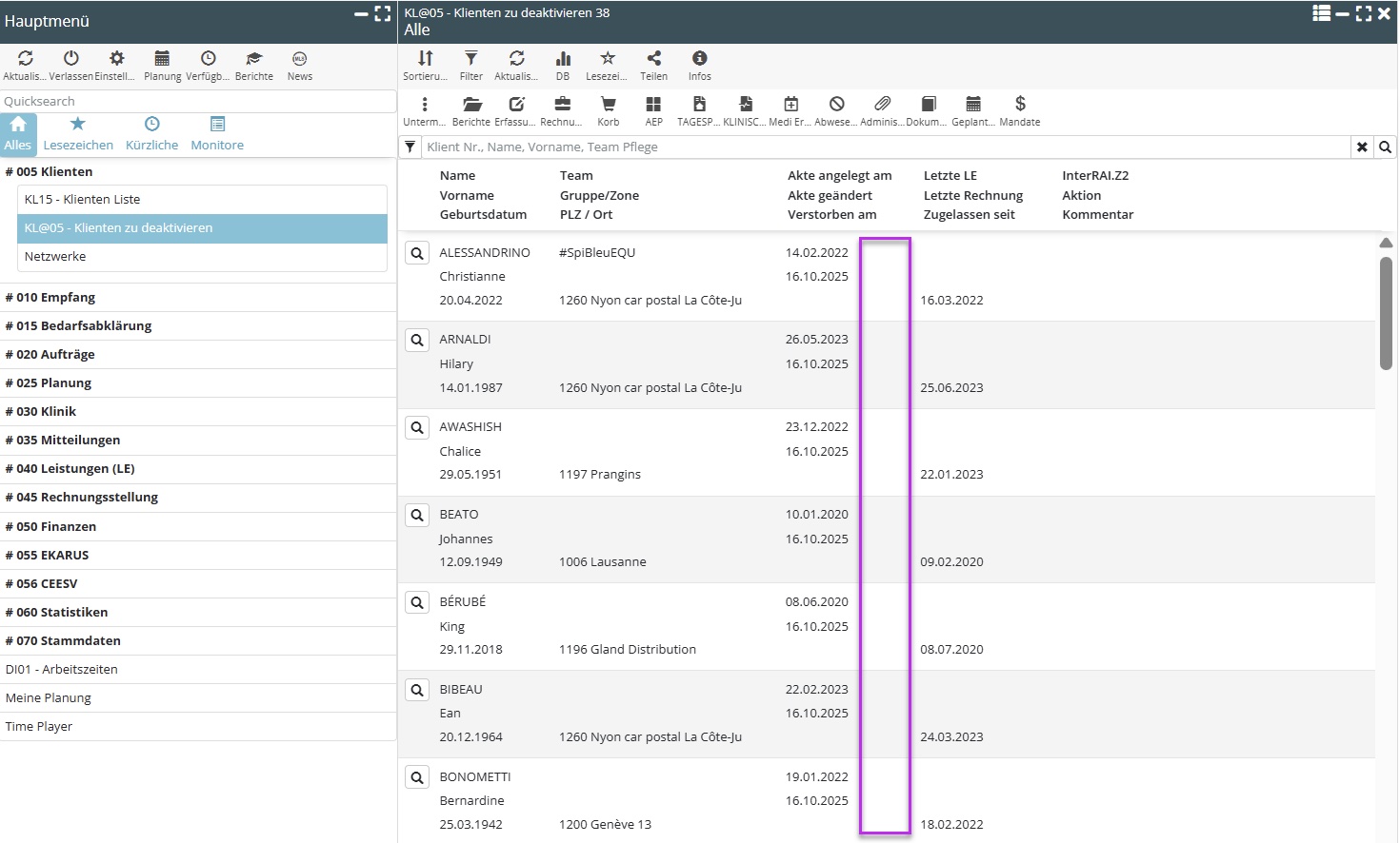👉 In der Checkliste „KL@05 – Klienten zu deaktivieren” wurden die Uhrzeiten aus den meisten Datumsfeldern (Akte angelegt, Verstorben am usw.) entfernt, um die Lesbarkeit zu verbessern.