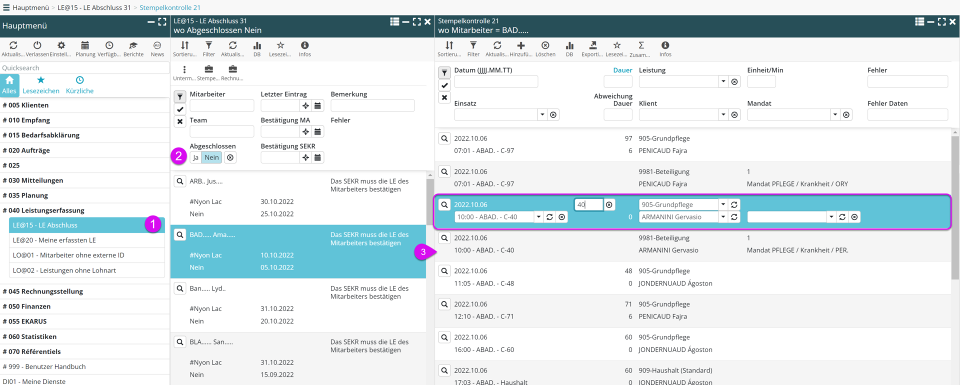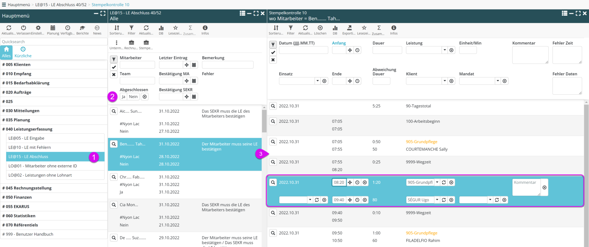 So kontrollieren Sie von derselben Ansicht aus die Tage der Mitarbeiter, nehmen eventuelle Anpassungen vor und geben Mitarbeiter mit abzuschließenden LE frei