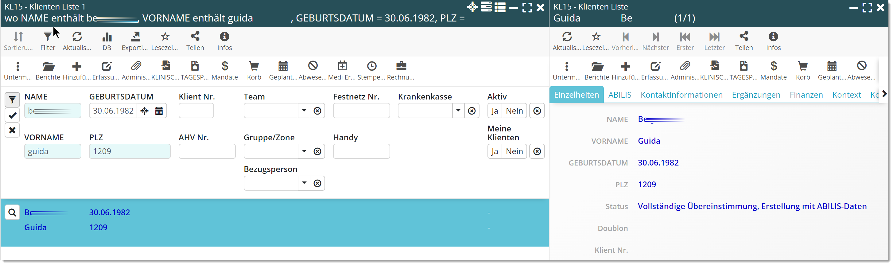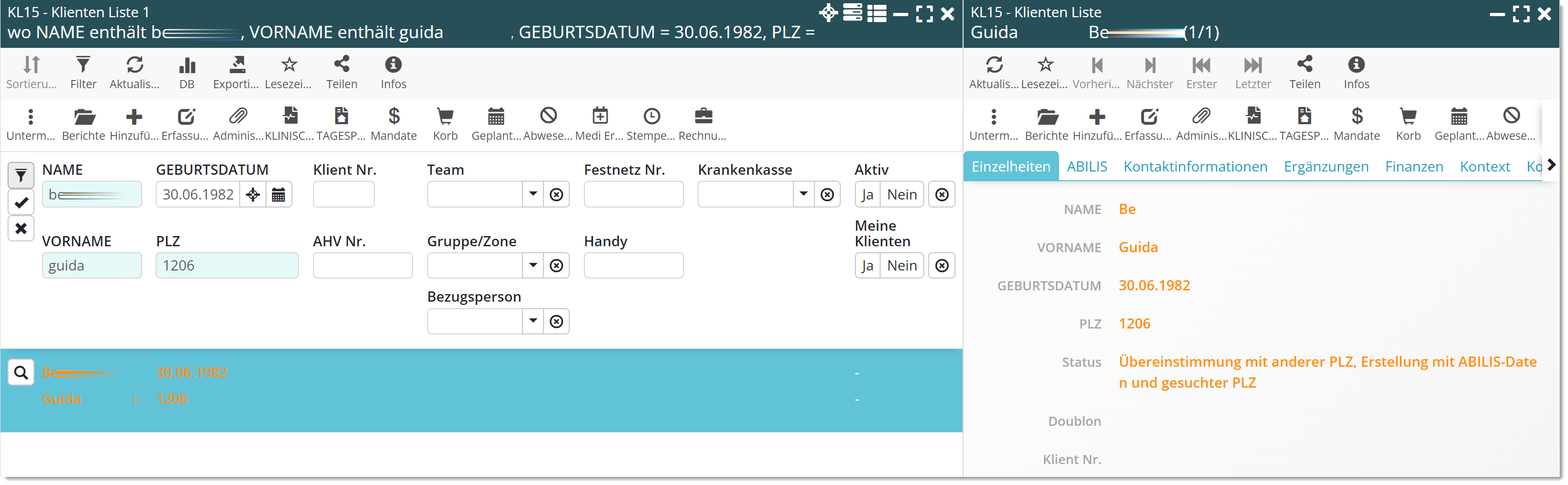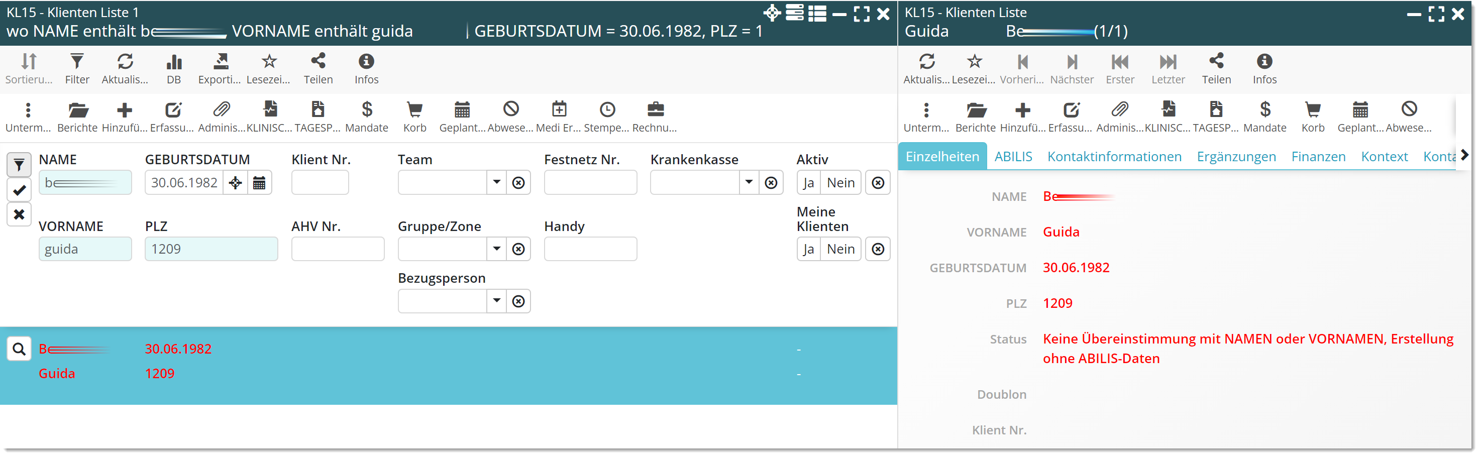 Die Suche nach einem Klienten erfolgt weiterhin anhand der 4 Identifikationsdaten: Nachname, Vorname, Geburtsdatum und PLZ.