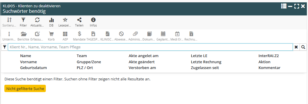 Um einer erleichterten Anwendung besser gerecht zu werden, werden mehrere Ansichten auf eine Filterfunktion umgestellt: Die Ergebnisse werden erst nach Festlegung der Suchkriterien angezeigt. Es genügt, ein Kriterium auszuwählen, um die Suche einzugrenzen, oder direkt auf Nicht gefilterte Suche zu klicken, um bei Bedarf doch wieder alles anzuzeigen.