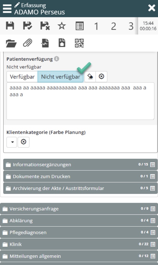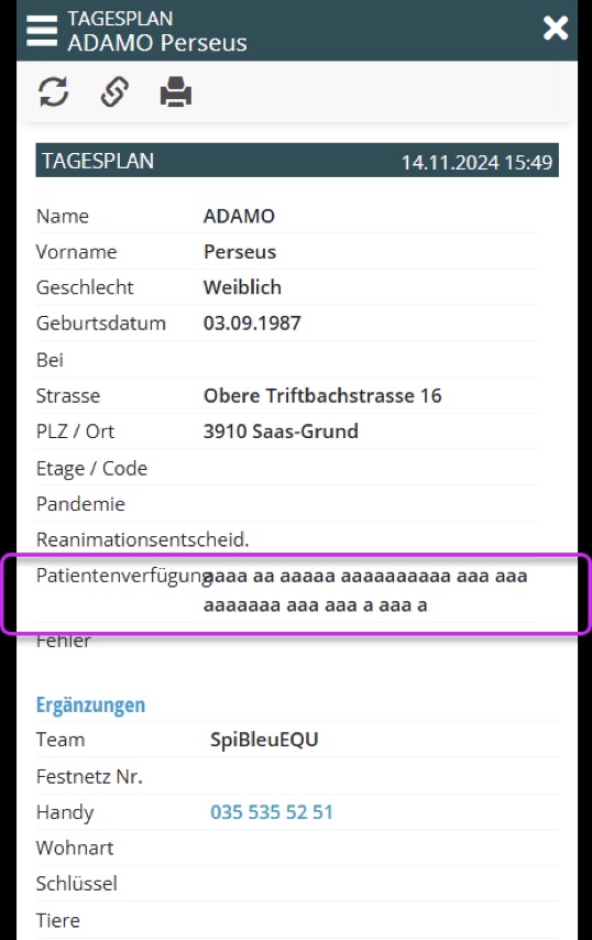 Informationen zur Patientenverfügung finden Sie in der Kopfzeile des Tagesplans und im Abschnitt Medizinische, pflegerische Informationen.