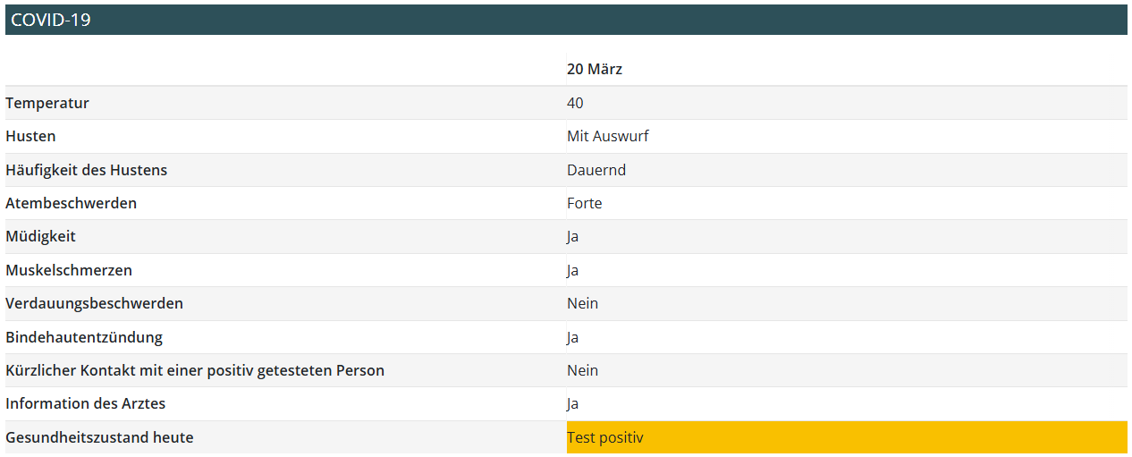 Der Bereich für die COVID-Bewertungsergebnisse zeigt die Daten der letzten drei Monate an.