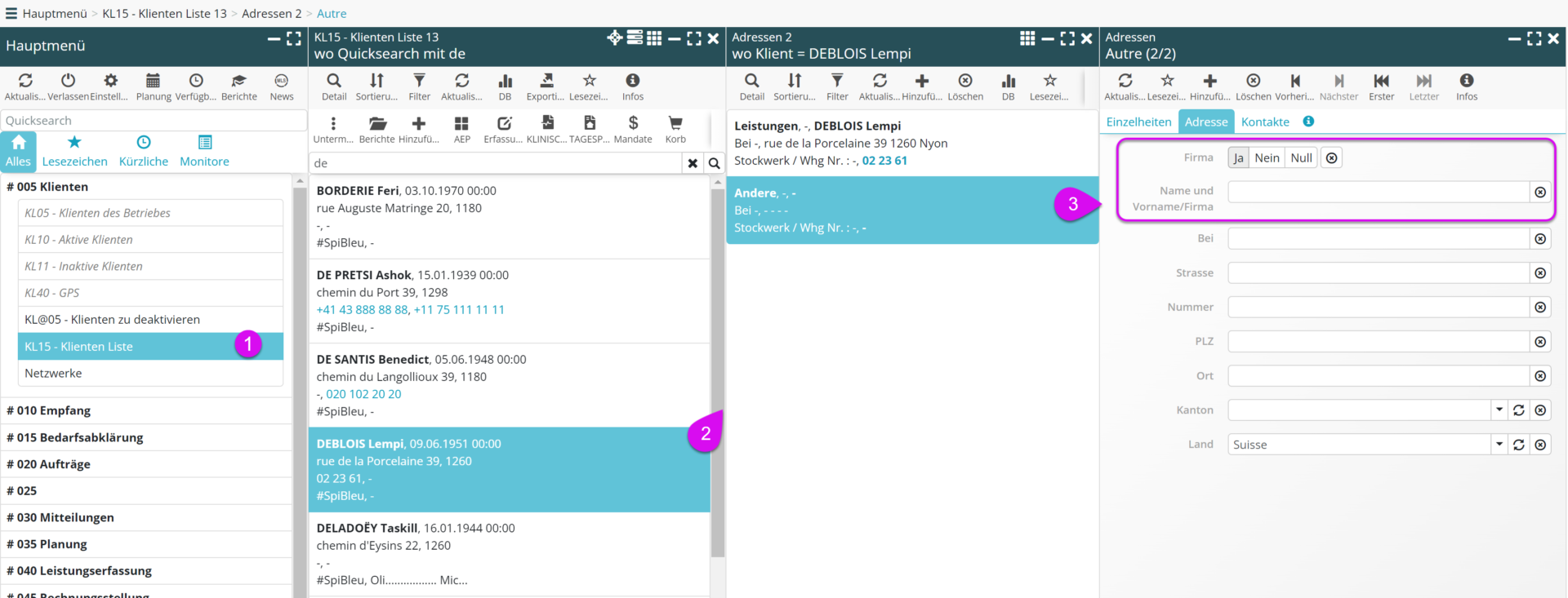 Das Feld Firma muss auf JA gesetzt werden und der von der Institution getragene Name muss in das Feld ‚Nachname und Vorname / Firma‘ eingetragen werden.