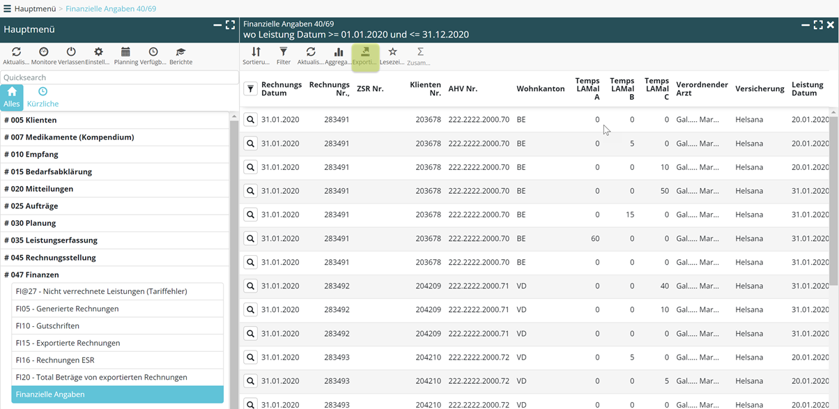 Das Menü ‚Finanzielle Angaben‘ zeigt für alle exportierten Rechnungen: das Datum der Leistung, ihre Dauer (A, B, C) und den Rechnungsbetrag. Darüber hinaus verfügen Sie über zusätzliche Informationen (Wohnkanton, Verordner, Versicherung, usw.), mit denen Sie die im Rahmen der Restfinanzierung verlangten Zusammenfassungen vornehmen können.