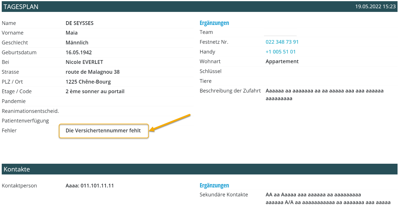 Um solche fehlenden Daten hervorzuheben, werden diese nun in der Kopfzeile des Tagesplans aufgeführt und sind für alle Mitarbeiter sichtbar. Sie müssen die Informationen nur mittels einer Mitteilung übertragen, ggfs. mit einem Foto des Dokuments.