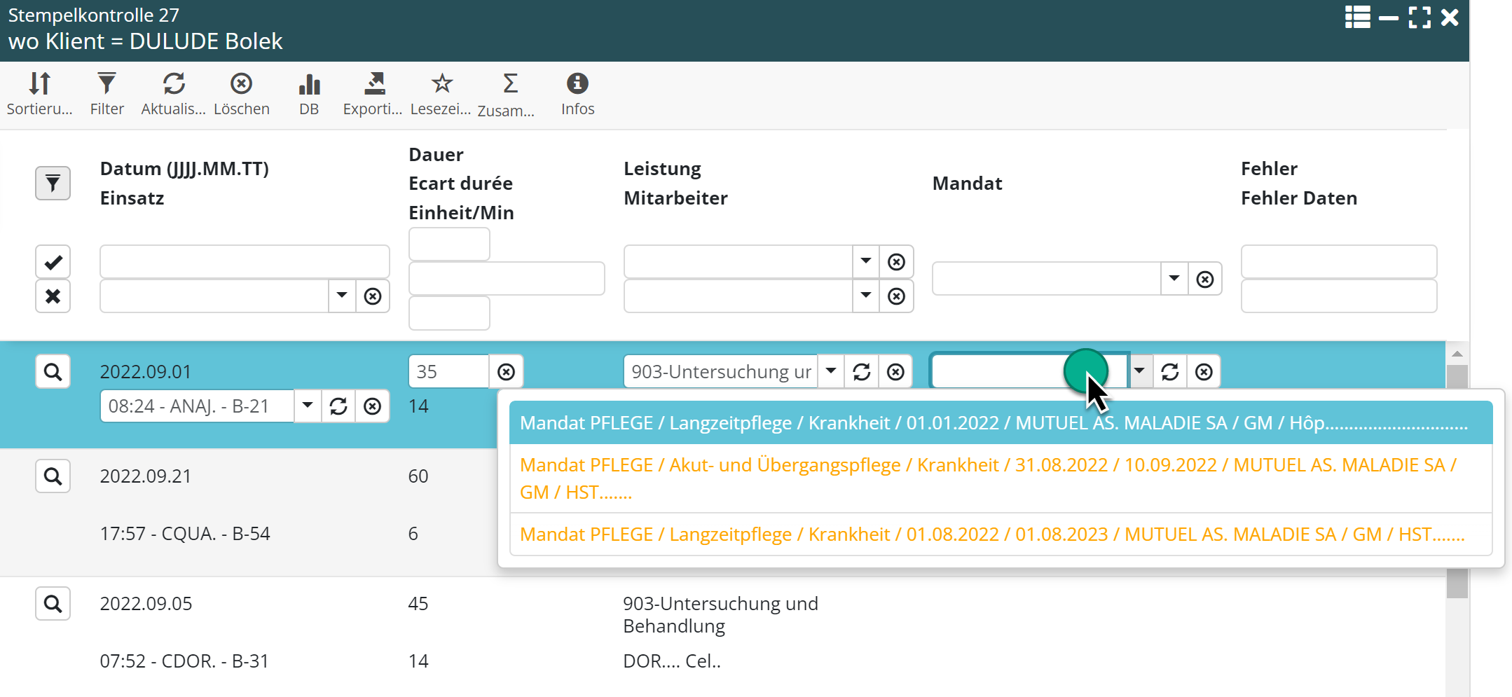 - Um Fehler zwischen KLV- und N-KLV-Leistungen zu vermeiden, wird die Dropdown-Liste der Mandate kontextualisiert: Sie bietet für KLV-Leistungen nur die Mandate PFLEGE und nur die Mandate KLIENT für die anderen Leistungen an.