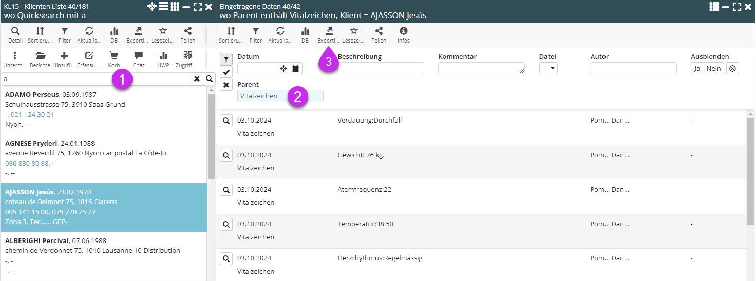 Um beispielsweise die für einen Kunden aufgezeichneten „Vitalparameter“-Werte zu extrahieren: