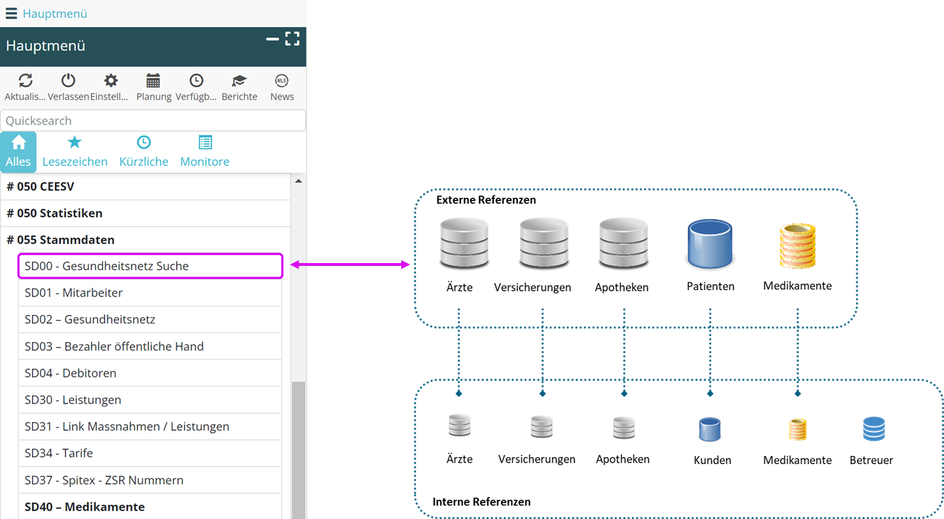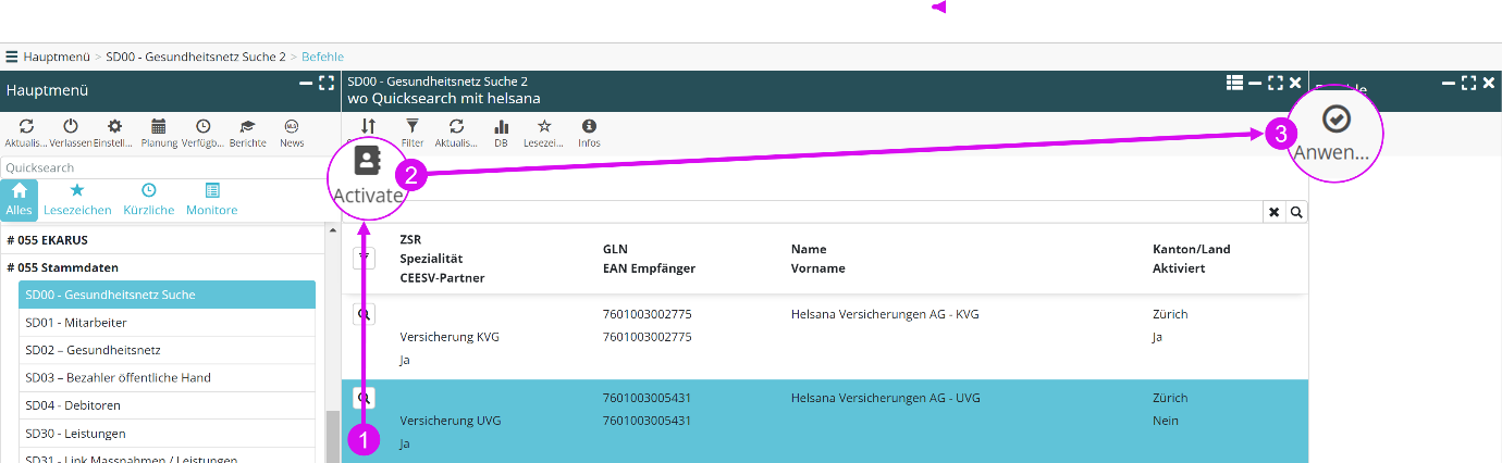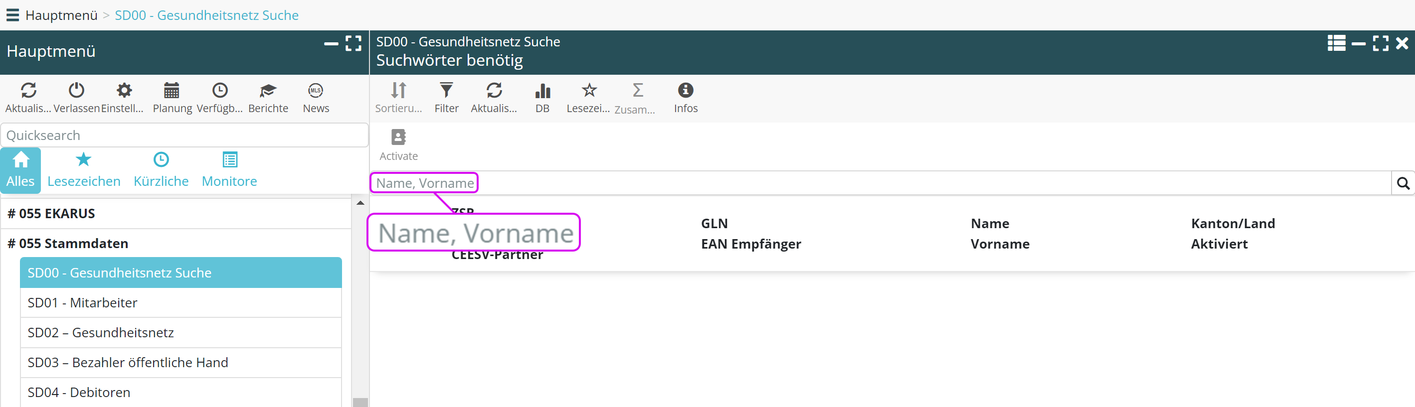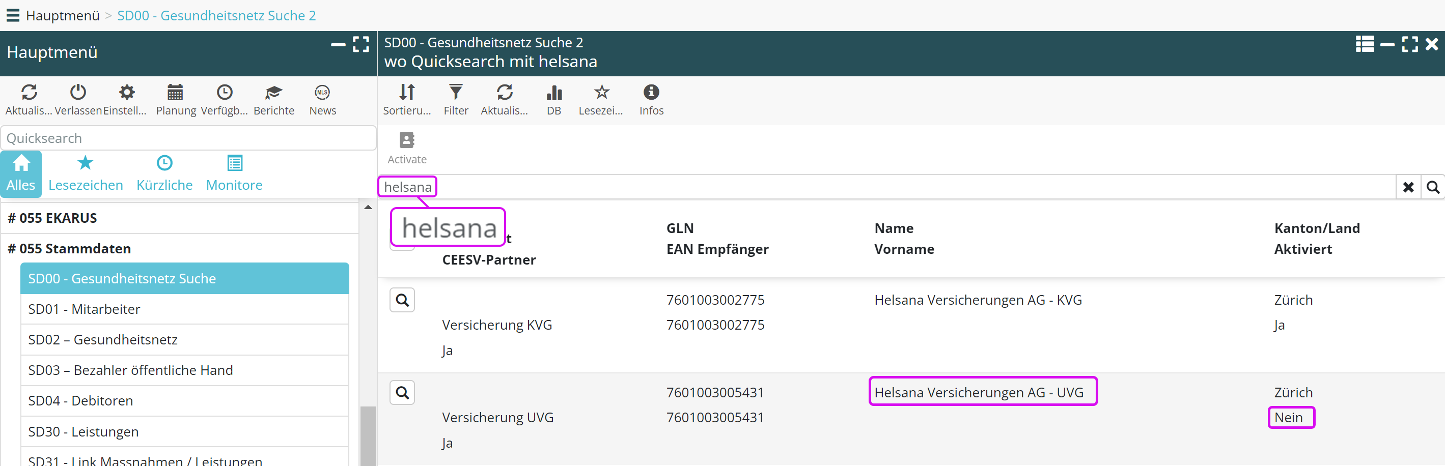 Um die Navigation zu vereinfachen, ist die Suche und Aktivierung von Partnern nun über ein einziges Menü möglich: SD00 – Gesundheitsnetz Suche.