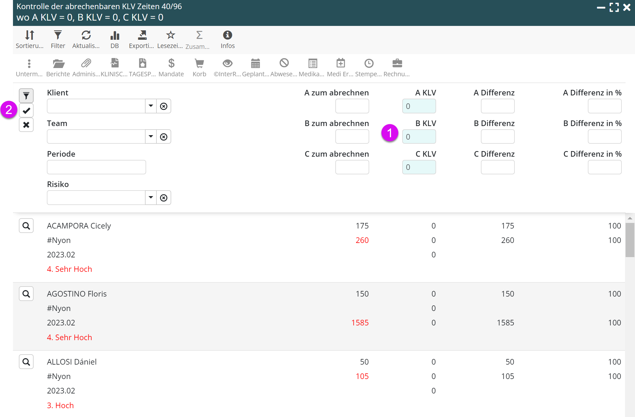 Gehen Sie zu Kontrolle der verrechenbaren KLV-Zeiten und wenden Sie einen Filter mit KLV-Dauern = 0 für die Leistungen A, B und C an.