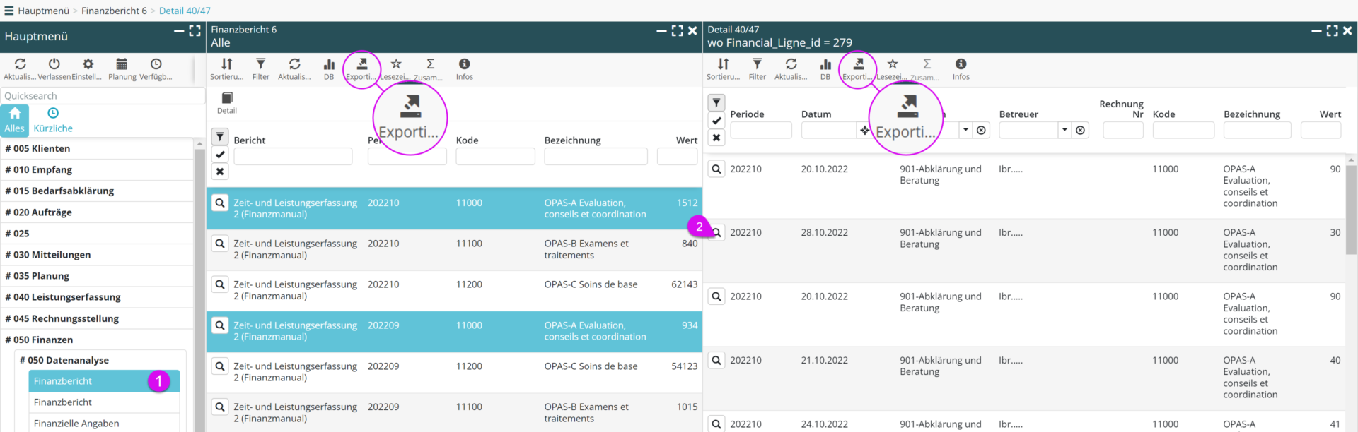 In den Online-Finanzberichten können Sie bis zu den Detailzeilen der im Bericht berücksichtigten Tätigkeitsnachweise heranzoomen. Jede Gruppierungsebene ist exportierbar.