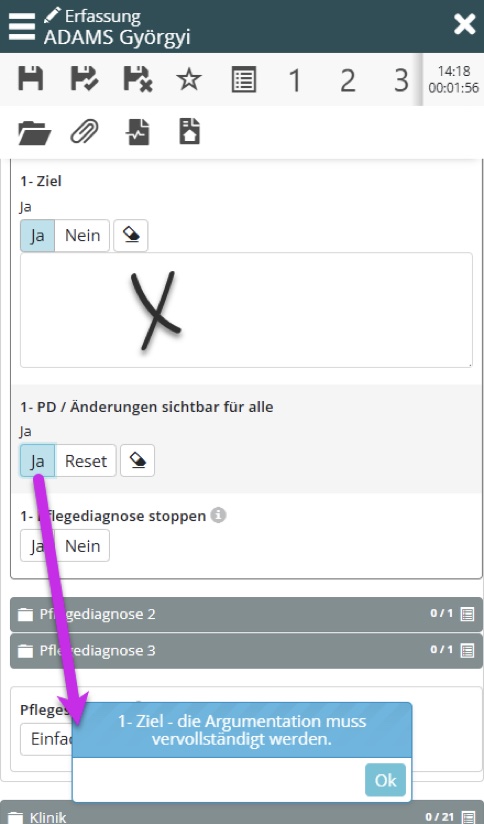 Bei positiven Antworten auf die Items „Beeinflussende Faktoren “, „Kennzeichen “ und „Ziel “ muss eine Dokumentation erstellt werden. Wird dies versäumt, wird die Veröffentlichung des Pflegediagnoseprozesses gesperrt und eine Warnung zeigt an , wo die Dokumentation ergänzt werden muss.