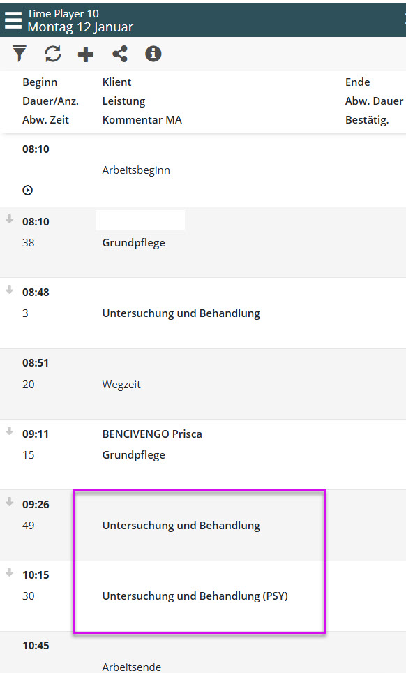 Im Rahmen der Nutzung des TimePlayers führt die Planung von psychiatrischen Maßnahmen automatisch dazu, dass die entsprechenden psychiatrischen Leistungen (PSY) für die Stempelung des Mitarbeiters angezeigt werden.