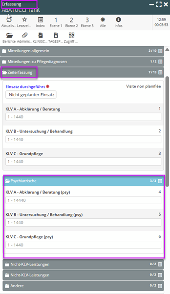 Wenn der TimePlayer nicht verwendet wird, erscheint bei der Erfassung unter „Zeiterfassung” ein neuer Abschnitt „Psychiatrische”. Dort kann die Interventionszeit direkt unter der entsprechenden Leistungsart eingegeben werden.