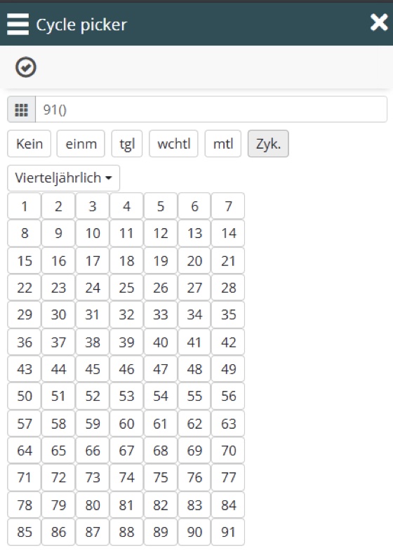 Der Zyklus der Frequenz „Vierteljährlich “ wird von 90 auf 91 Tage (Vielfachesvon 7) erhöht, wodurch es möglich wird, vierteljährliche Massnahmen am gewünschten Tag in der Woche zu planen. Der 90-Tage-Zyklus bleibt verfügbar und wird in „Vierteljährlich (veraltet)“ umbenannt.