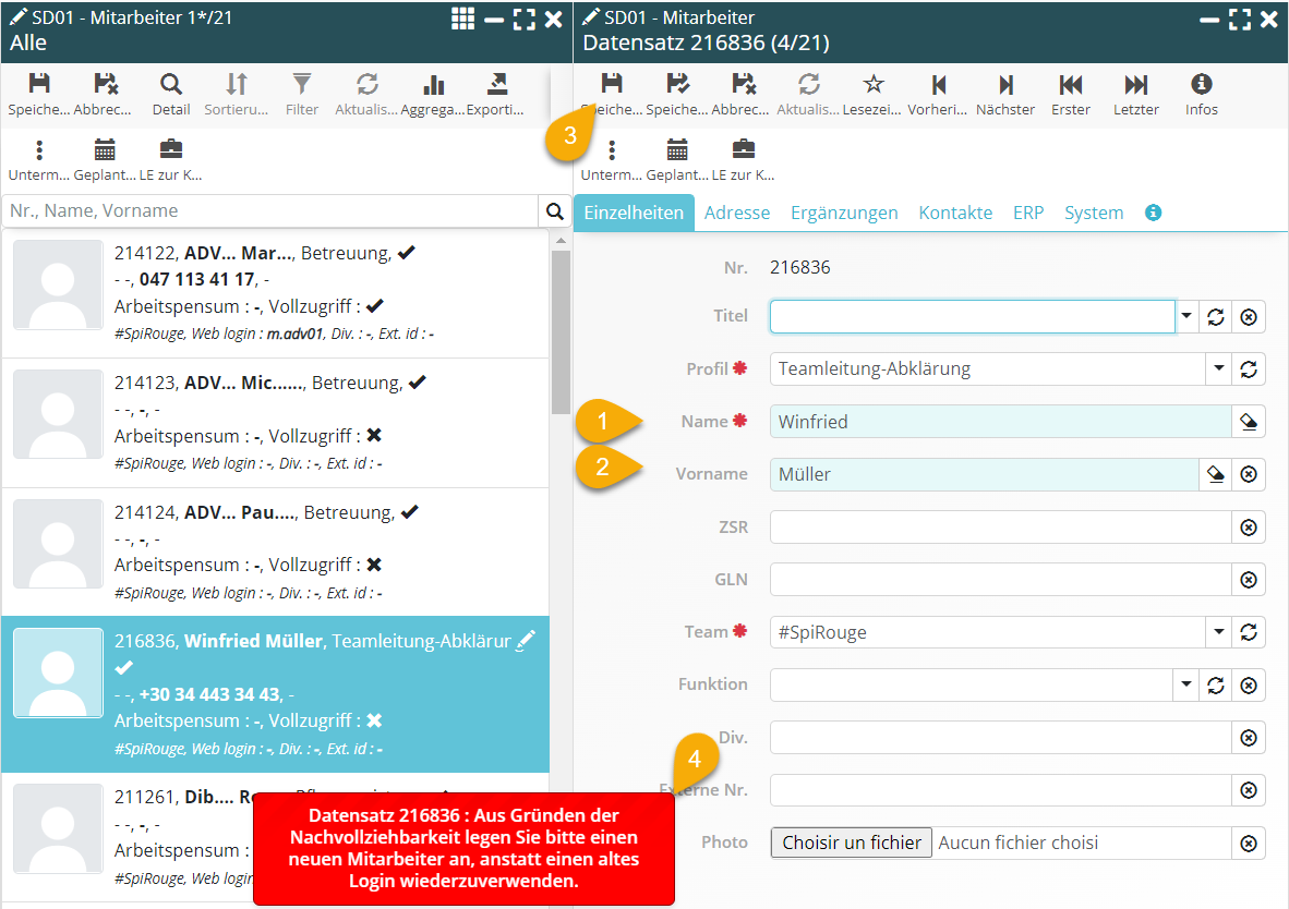- Verbieten Sie die Wiederverwendung bereits bestehender Logins: Sie könnten durch einfaches Umbenennen und Ändern der Kontakt-Nr. einem neuen Mitarbeiter ein bestehendes Login zuweisen. Diese Praxis verhindert auch die namentliche Rückverfolgbarkeit von Akten.