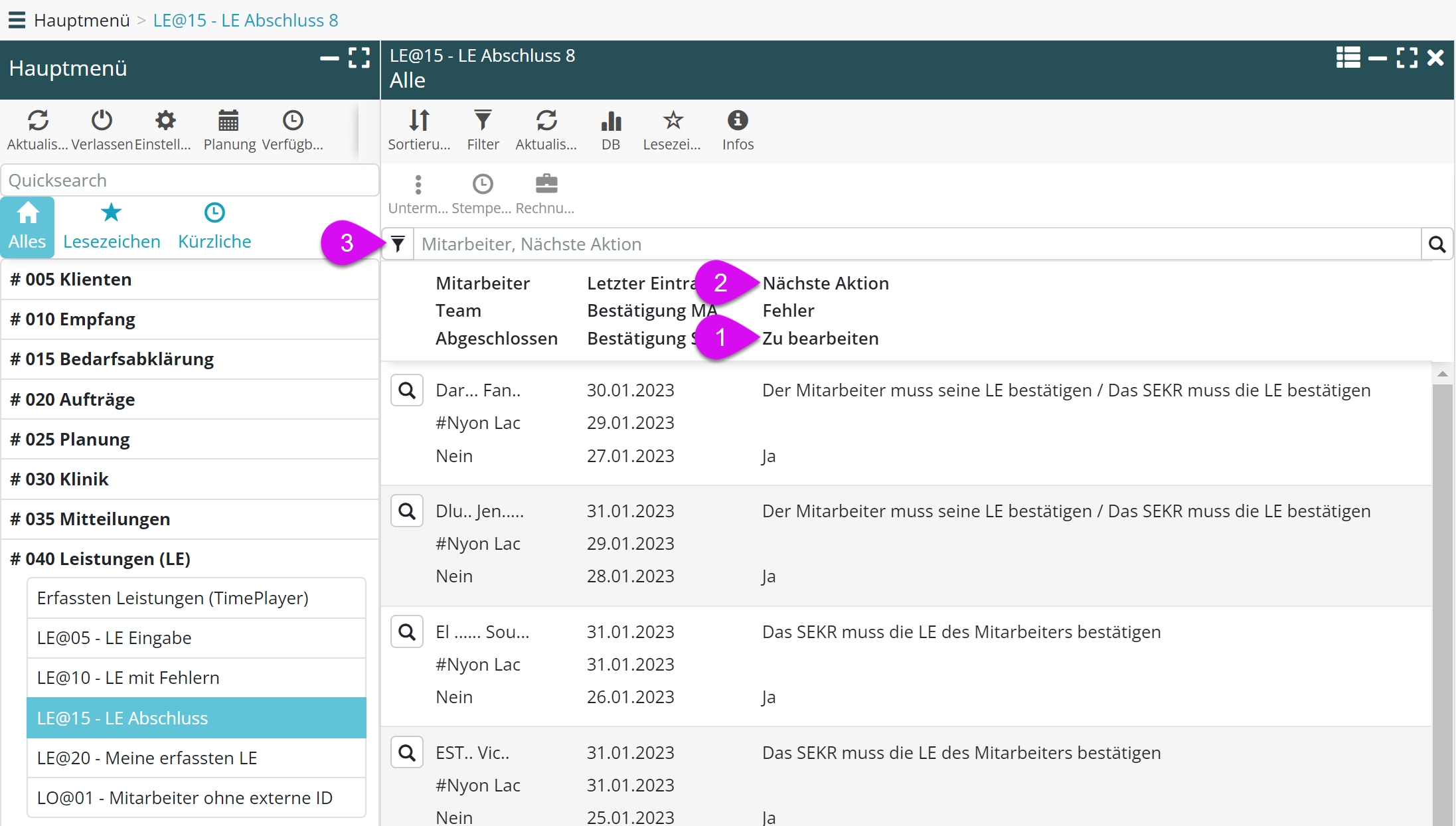 - Auf das Wesentliche fokussieren: Ein Schnellsuchfeld ermöglicht es, nach ausstehenden Aktionen und Mitarbeitern zu filtern.