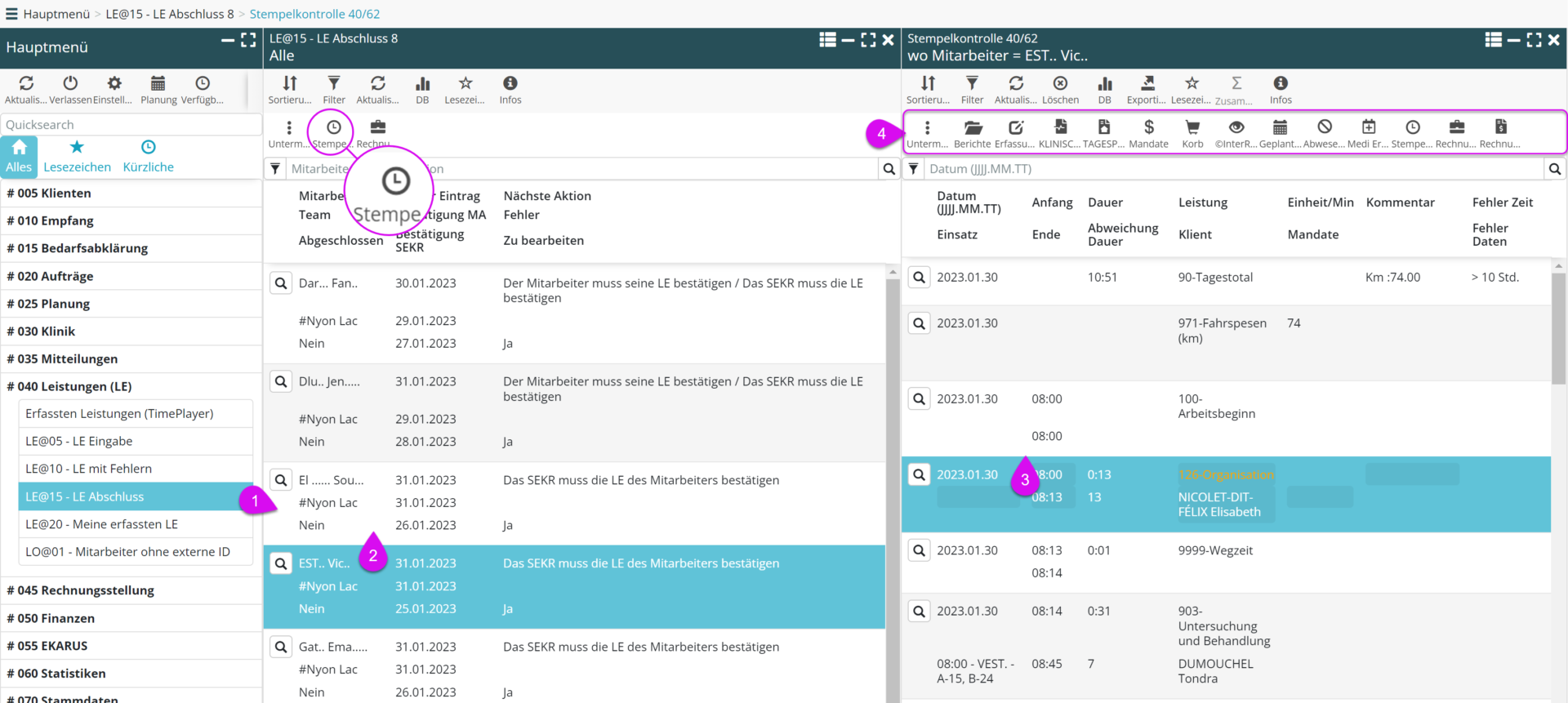 Um Zeit und Effizienz zu gewinnen, können Sie sich mit den Listen LE@15 – LE Abschluss und Stempelkontrolle auf die Erfassungen von Mitarbeiter konzentrieren, die effektiv Ihr Aufmerksamkeit erfordern.