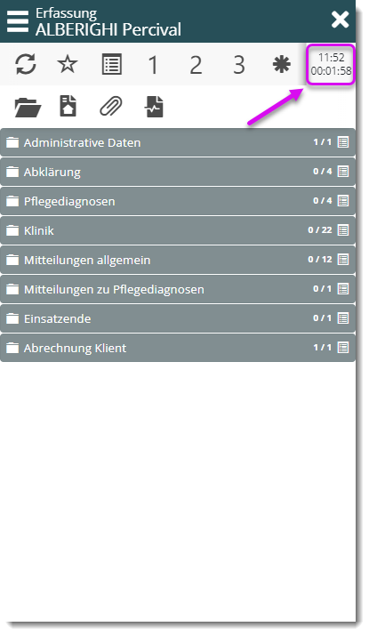 Oben rechts im Formular befindet sich der Chronometer, der folgendes anzeigt: