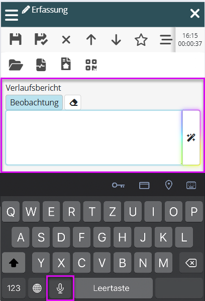 Selbstverständlich können Sie auch die Sprachsteuerungsfunktion nutzen: Sie sprechen frei, MedLink strukturiert und formuliert den Inhalt präzise und unter Berücksichtigung des Pflege-Kontexts neu. Achten Sie darauf, die Optionen des Mobiltelefons so zu konfigurieren, dass die Spracherkennung auch im Offline‑Modus funktioniert.