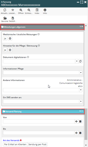 Während früher die Übermittlung des Einsatzplans beim Klienten unter einer eigenen Rubrik («Versand Planung») umgesetzt wurde, die sich am Anfang des Erfassungsformulars befand, ist diese nun in den Abschnitt «Mitteilungen allgemein» am Ende des Formulars integriert worden. Dies ermöglicht es, alle mit der Kommunikation zusammenhängenden Themen an einem Ort zu zusammenzufassen und folglich einen umfassenderen Überblick zu erhalten.