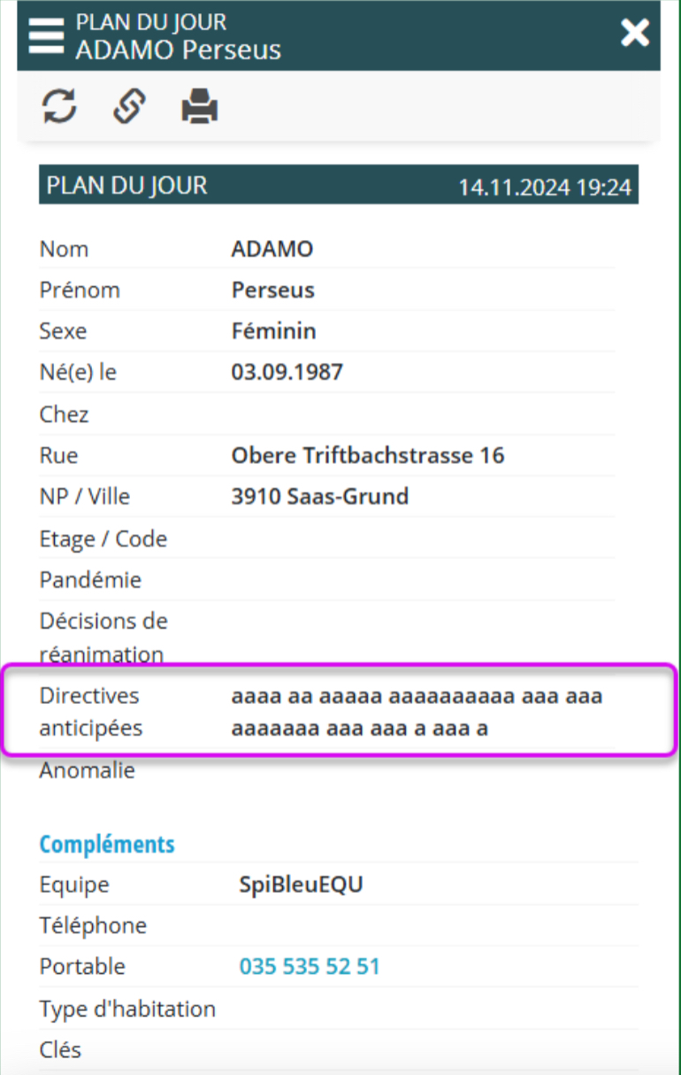 On retrouve les informations relatives aux directives anticipées dans l’entête de Plan du Jour et dans la section Informations médico-sociales.