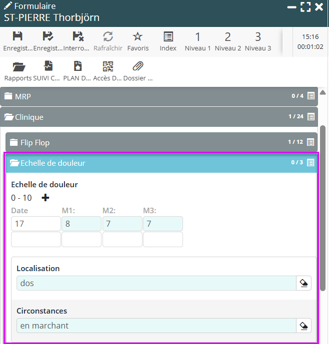 Ce n’est qu’à cette condition que la localisation et les circonstances peuvent être saisies. Cette logique assure que chaque donnée contextuelle soit liée à une mesure réelle, datée et cliniquement exploitable.