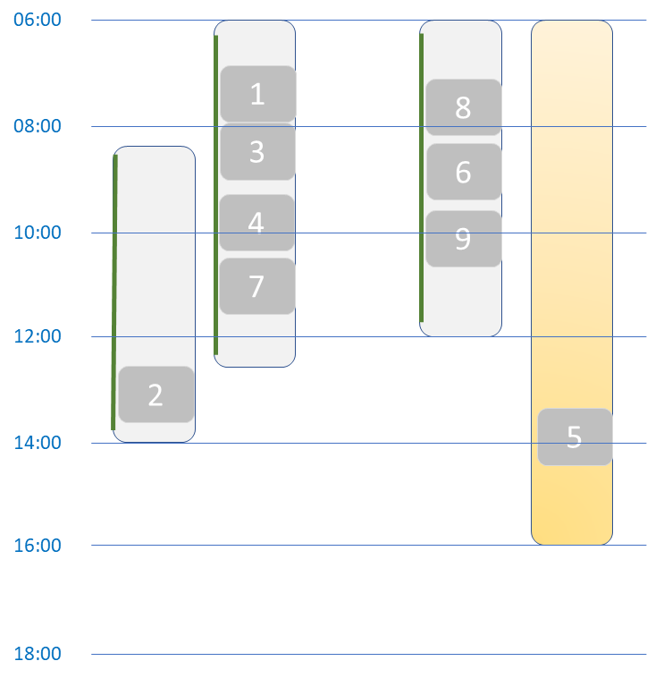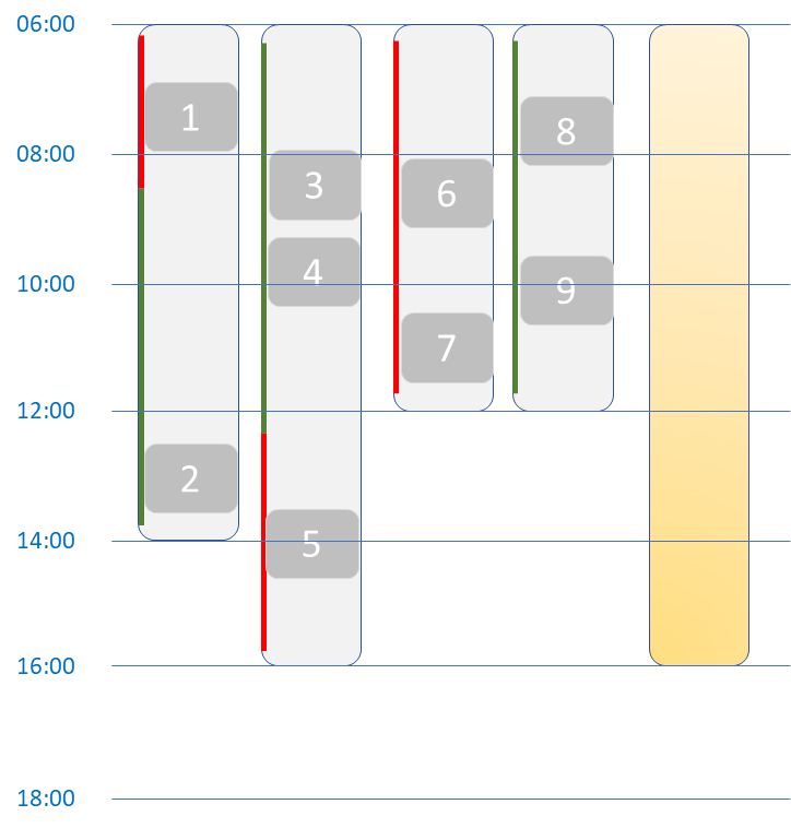 Le modèle basé sur la demande des clients reflète les horaires de services tels que définis par l’OSAD. Dans l’illustration ci-contre, 4 tournées sont planifiées (fond grisé), la tournée de délestage (fond orange) est vide et les barres verticales rouges et vertes indiquent la disponibilité ou l’indisponibilité de la ressource assignée à la tournée.