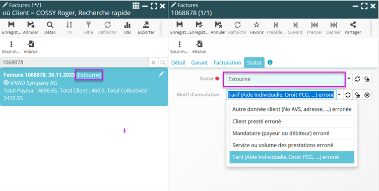 Lors d’une extourne partielle, MedLink analyse automatiquement les différences entre la facture initiale et la nouvelle facture :