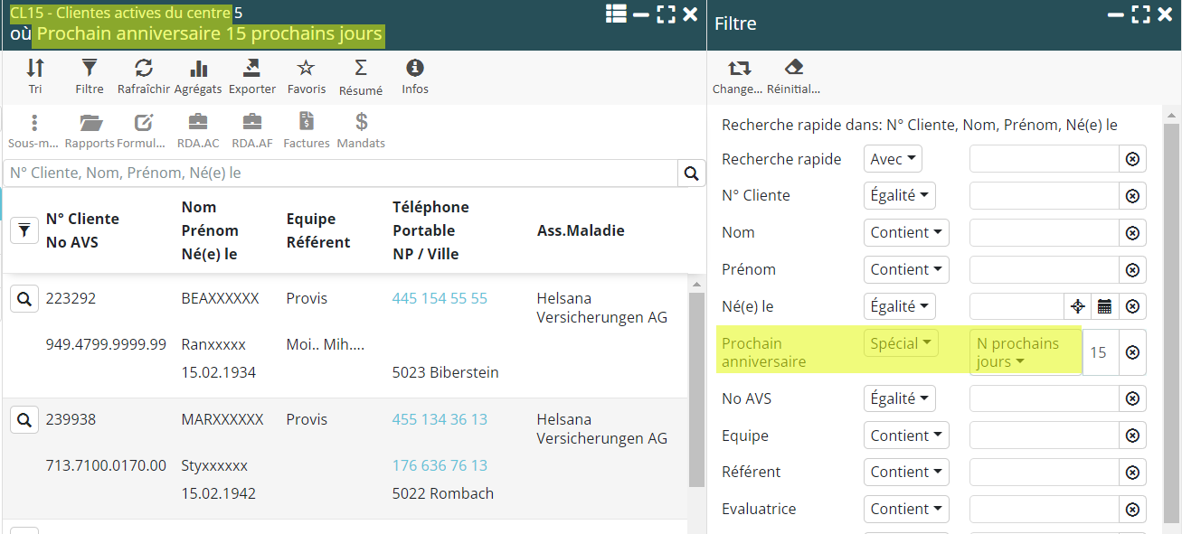 Dans la liste « CL15 – Clientes actives du centre », nous avons rajouté un critère dans les filtres qui vous permet de sélectionner les clients dont la date d’anniversaire tombe dans les N prochains jours. En créant un favori, vous avez la possibilité d’intégrer à votre environnement MedLink une liste personnalisée qui vous rappelle à l’avance le jour d’anniversaire de vos clients.