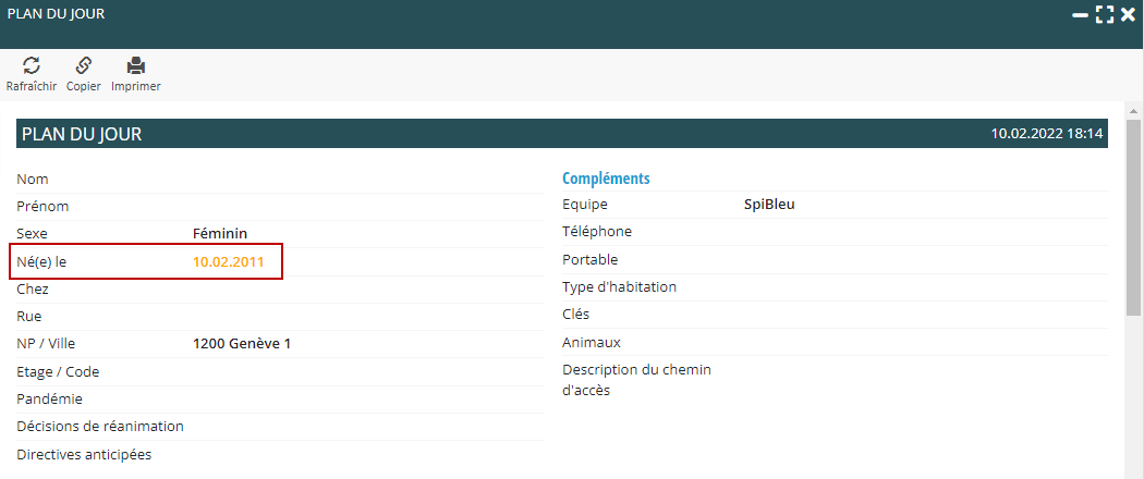 Pour les soignants intervenant chez le client, l’information est également mise en avant dans le « plan du jour » : Le jour de son anniversaire, sa date de naissance est présentée en couleur orange.