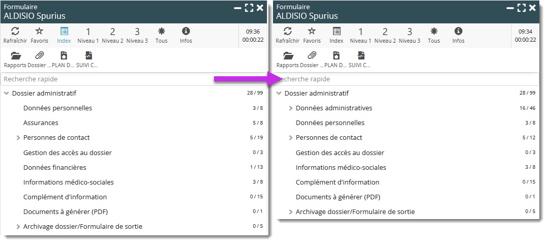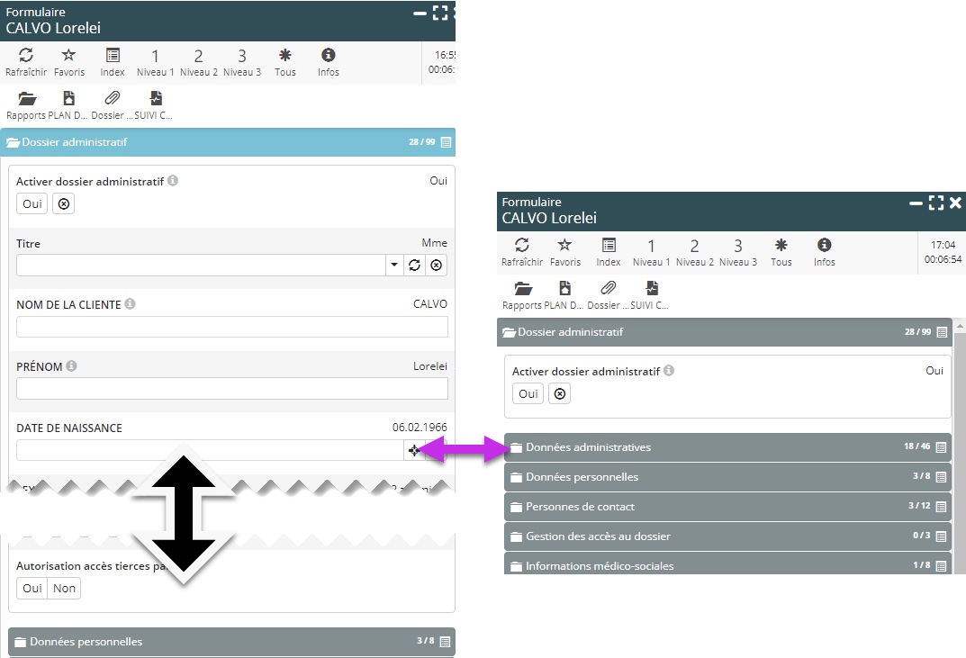 - Les données administratives ont été regroupées dans une section dédiée, permettant ainsi d’atteindre sans scrolling les sections inférieures.
