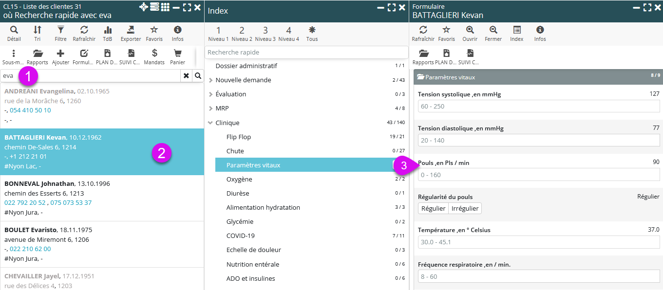 L’exemple suivant montre comment accéder aux paramètres vitaux en 3 clics :