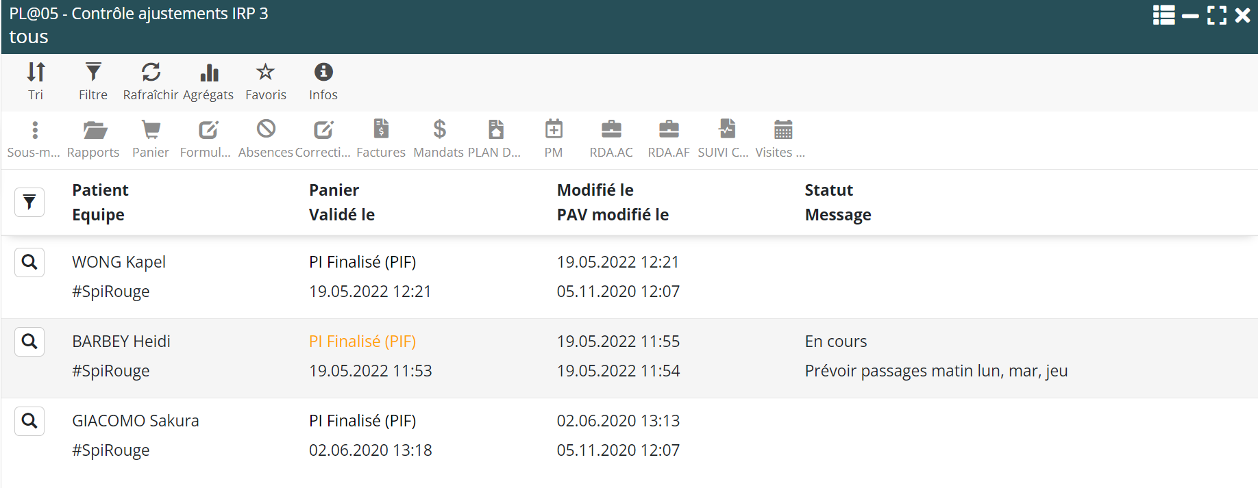 Le menu ‘PL@05 – Justif ajustements IRP’ devient un outil permettant de contrôler toutes les modifications de panier et les changements consécutifs dans la programmation des visites.