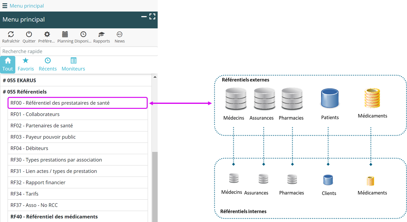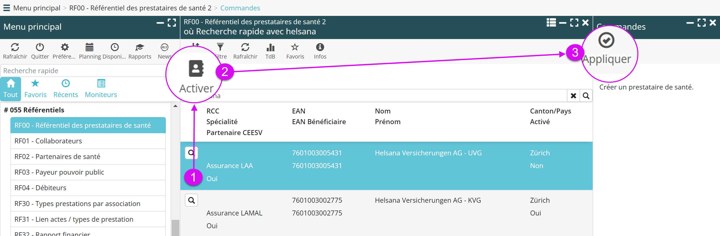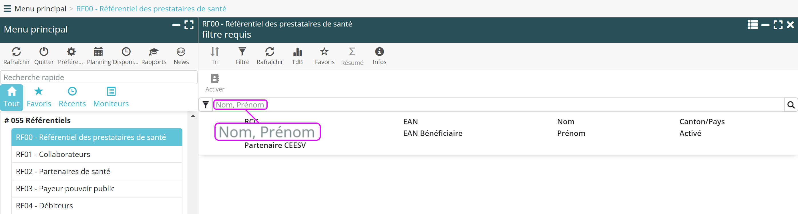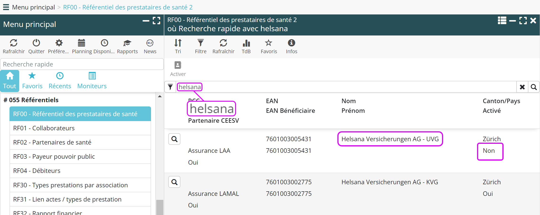 Pour simplifier la navigation, la recherche et l’activation des partenaire est désormais possible depuis un seul menu : RF00 – Référentiel des prestataires de santé.