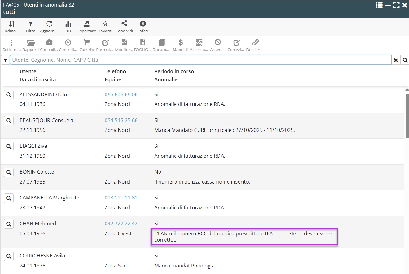 Queste discrepanze vengono segnalate nel campo “Anomalia” della lista FA@05, consentendo una correzione immediata prima della fatturazione.