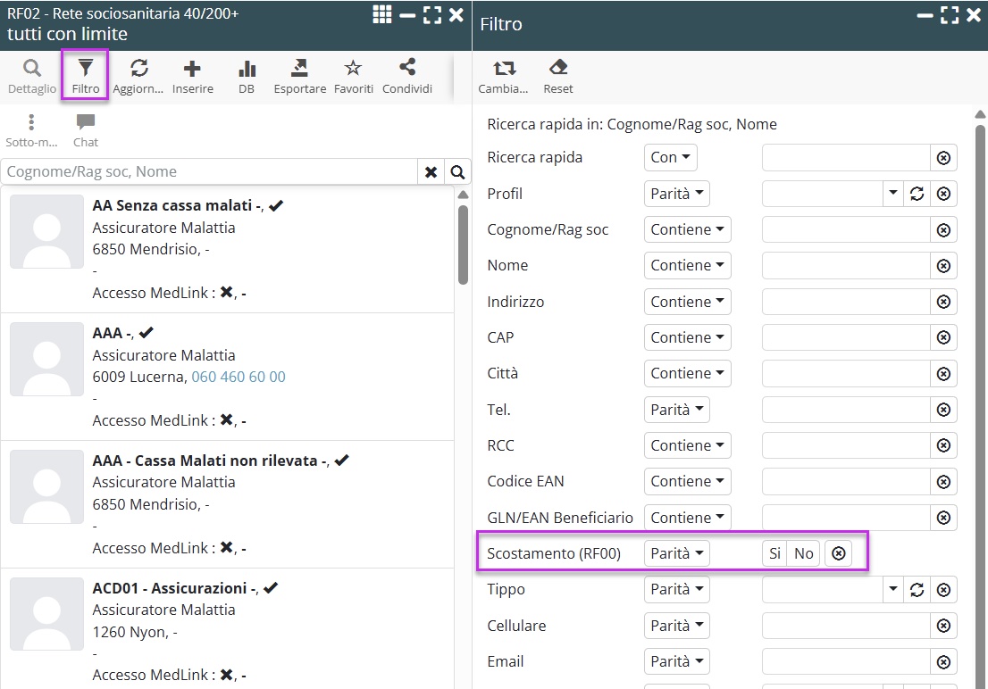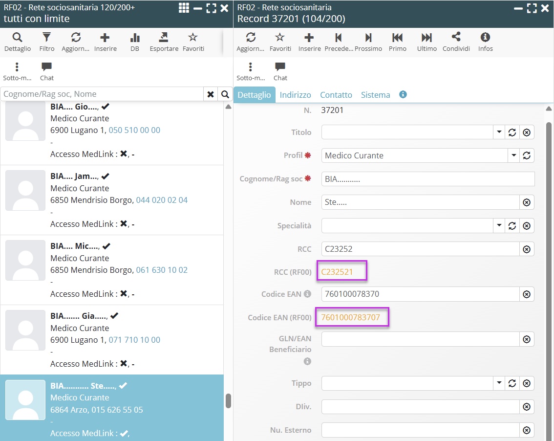 Per semplificare il controllo dei partner sanitari, la schermata RF02 mostra ora in modo chiaro i campi che presentano discrepanze rispetto al repertorio RF00, in particolare: