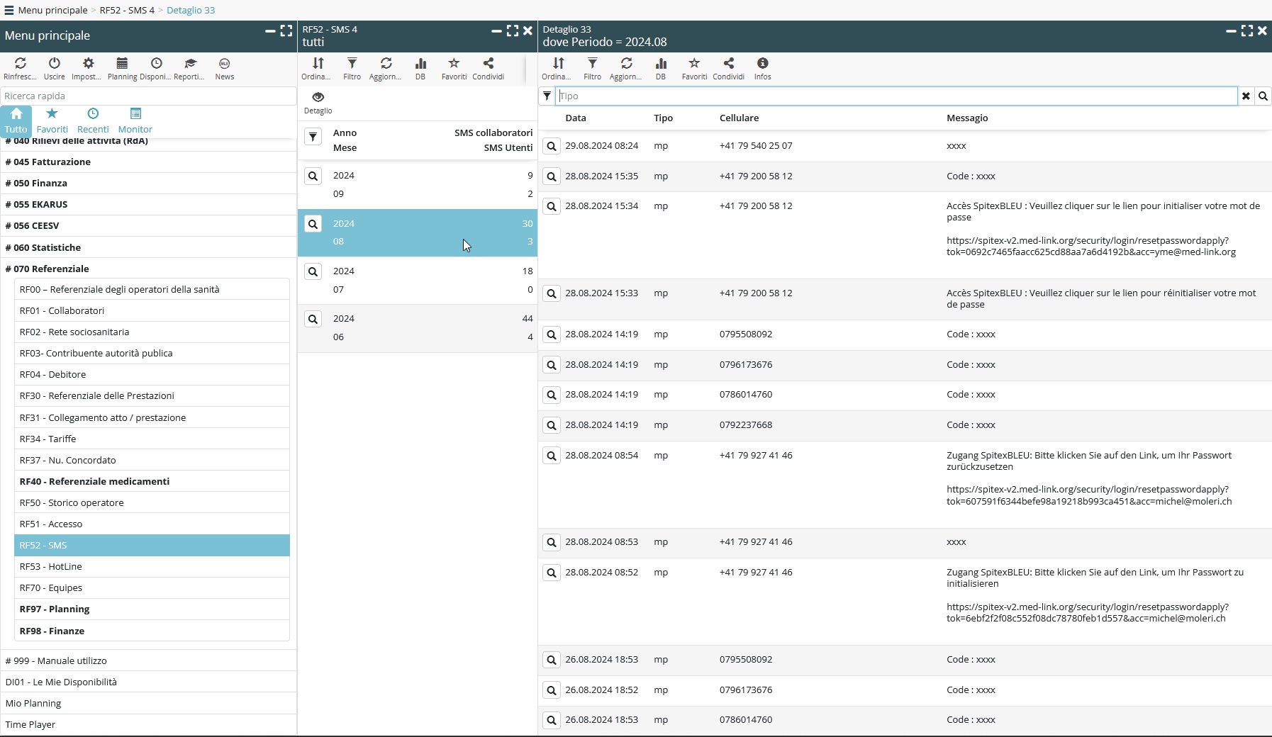 Lo storico dettagliato degli messaggino inviati è disponibile nel sottomenu RF-52 SMS di MedLink: