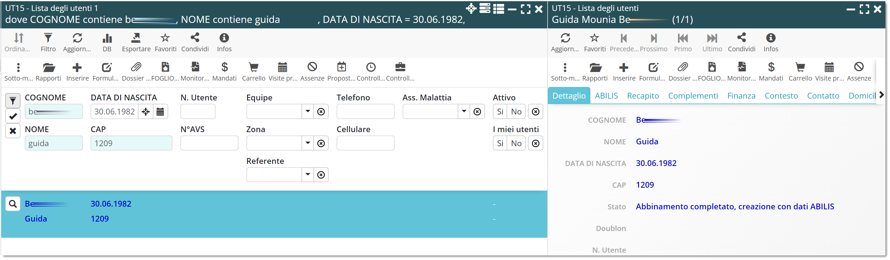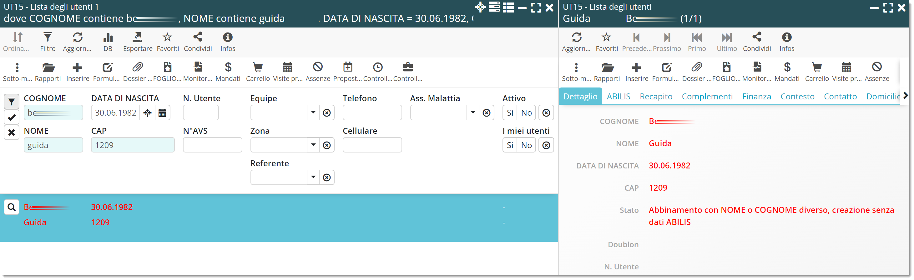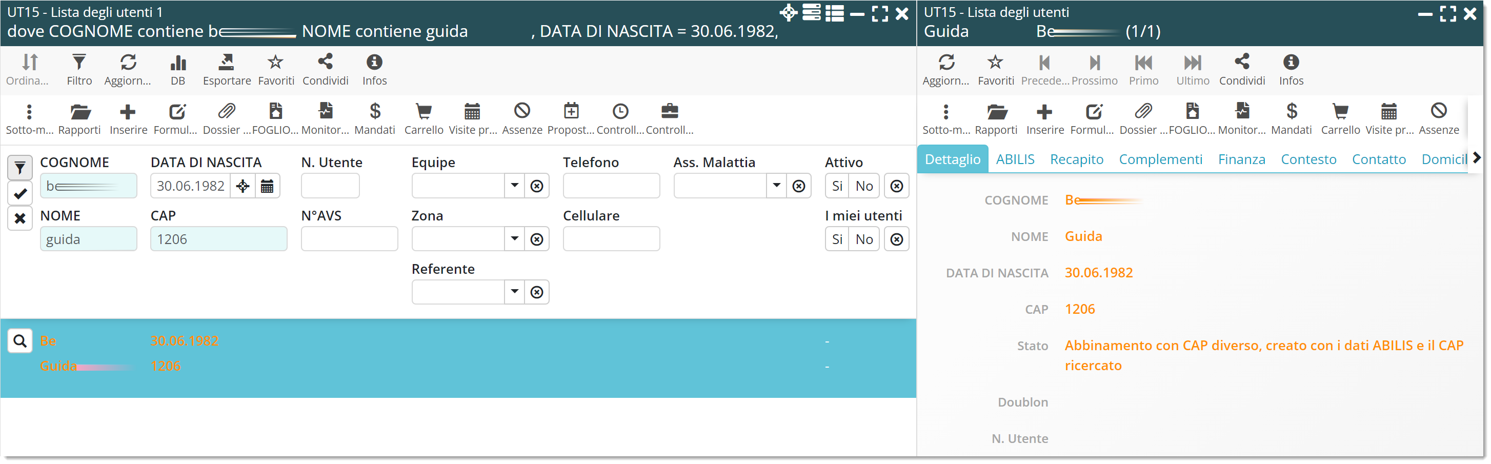 La ricerca di un utente si basa sempre sui 4 identificativi Cognome, Nome, Data di nascita e CAP.