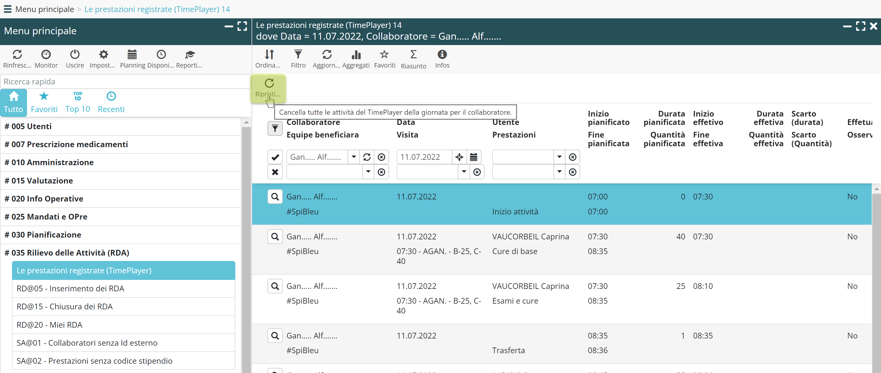 Un comando, accessibile dalla lista Le prestazioni registrate (TimePlayer), consente al back office di reimpostare la giornata di un collaboratore che si trova in una situazione di blocco. Il collaboratore può quindi riprendere immediatamente l’inserimento dei dati dall’inizio della giornata.