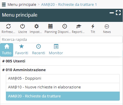 Le richieste da trattare, siano esse da assegnare o da gestire (rispettivamente negli attuali menù AM@20 e AM@30), sono ora raggruppate in un menù comune: AM@20 Richieste da trattare.