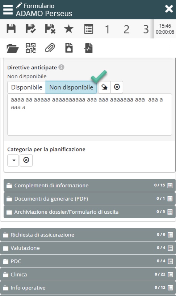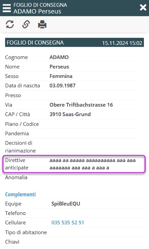 Le informazioni sulle direttive anticipate si trovano nel report FOGLIO DI CONSEGNA e nella sezione Informazioni medico-sociali.
