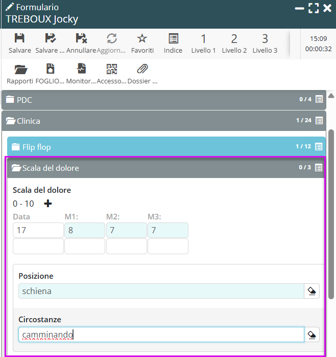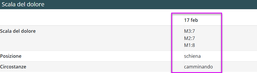 ➡️ È indispensabile registrare almeno un valore di intensità nella scala del dolore. Solo a questa condizione è possibile inserire la localizzazione e le circostanze.